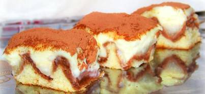 У змащену форму ( найкраще - прямокутну - 20x24 см) викласти половину тіста. До іншої половини додати какао і молоко, ретельно перемішати. Викласти коричневе тісто поверх білого.
