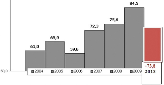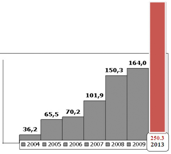В той статье были приведены цифры посредством таблиц и графиков. Спустя четыре года я повторяю эти графики, но в обновленном виде - добавляя данные 2013 года для каждого показателя. Получилось очень наглядно.
