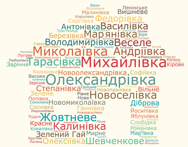 Розмір слова пропорційний кількості однакових назв населених пунктів в Україні.