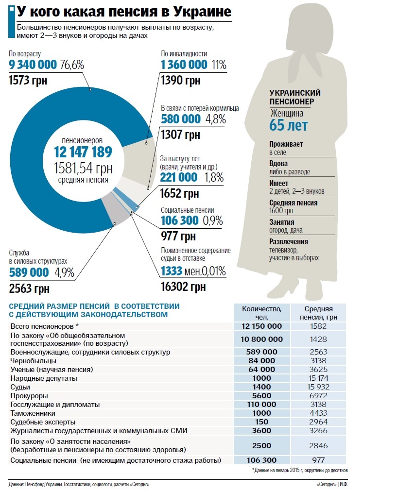 КОМУ ЩО. За підрахунками Пенсійного фонду України (ПФ) і Держслужби статистики, кожен третій українець – пенсіонер. У ПФ підрахували, скільки пенсіонерів та яку пенсію отримують (див. інфографіку).