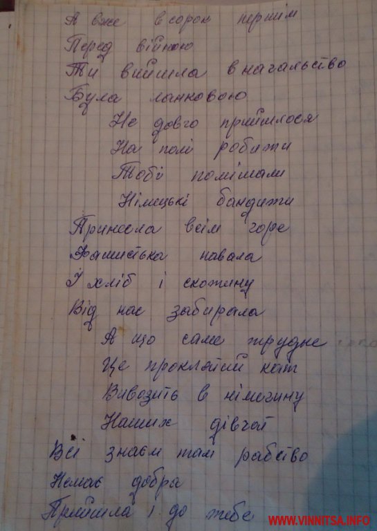 - Одного разу той німець, що жив на квартирі в хаті через дорогу, виграв в карти, і одна дівчина сказала на нього: «От паскуда!» А він питає: «Вас іст паскуда?» (що таке паскуда?). Вона каже: «Це означає «майне лібе» (мій любий). То він тоді кілька днів ходив і говорив: «Вєра, майне паскуда», аж поки хтось йому не розказав. То вона після того сиділа тиждень на горищі, бо він німець сказав, що заб’є її…