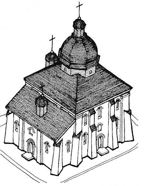 Можливий вигляд храму після капітального ремонту. У притворі відбувалися судові засідання. Зображення Петра Троневича з книги "Луцький замок в історії України"