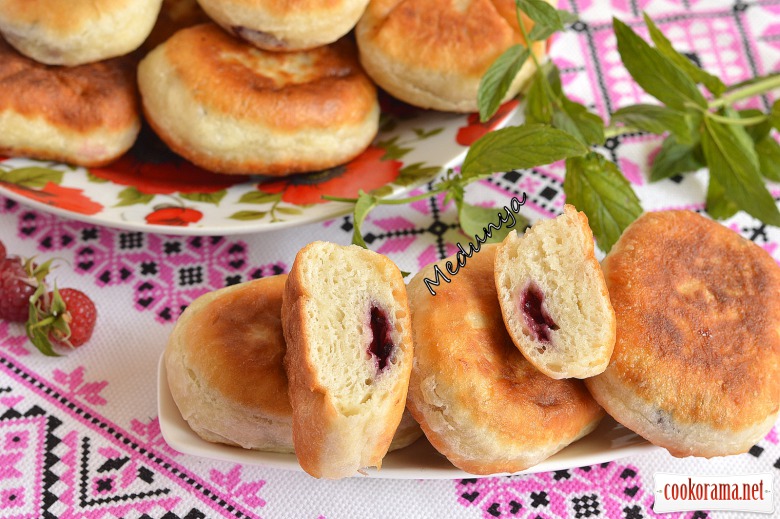 Розділити тісто на шматочки. Зліпити пиріжки з улюбленою начинкою. Достатньо сильно сплюсніть вироблений пиріжок (він добре виросте під час готування вверх, тому не переживайте на рахунок цього). Обсмажувати на пательні з олією з обох боків до золотистого кольору (вогонь нижче середнього).