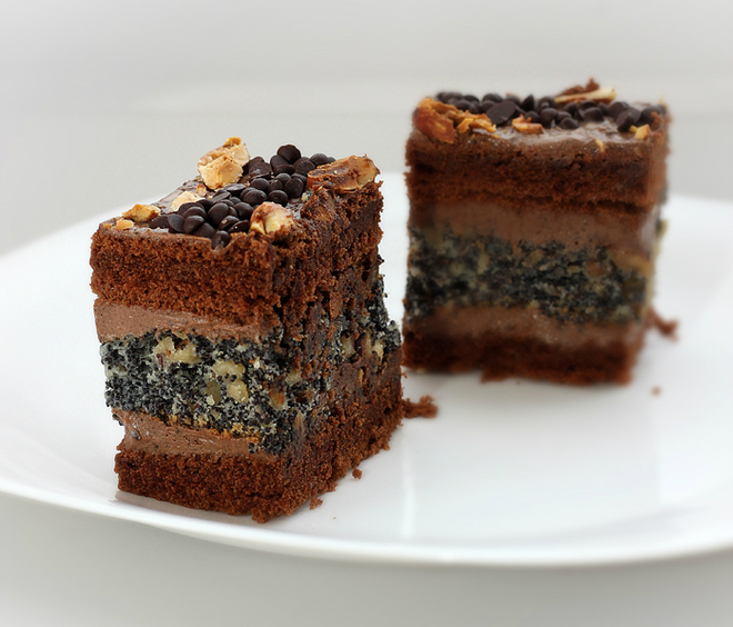 Як збирати пляцок, добре видно на фото: на чорний корж намазуємо половину крему. Потім маковий корж, знову крем і чорний корж. Прикрашаємо зверху горіхами та шоколадом.