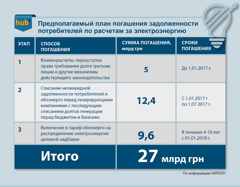 Щоб знайти вихід з ситуації, що склалася, НКРЕКП і ініціативна група учасників енергоринку, яку очолила радник гендиректора ДТЕК Енерго Ірина Протопопова, представили на суд учасників ринку план ліквідації загальної заборгованості споживачів за розрахунками за електроенергію в кілька етапів (Див. «Передбачуваний план погашення заборгованості споживачів за розрахунками за електроенергію»).