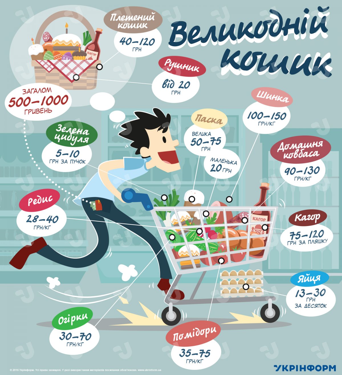 Кожен продукт тут має своє символічне значення, а перелік цих продуктів різниться для різних регіонів України. Проте, обов'язковими складовими святкового великоднього кошика для всіх українців є паска, яйця (писанки, крашанки, крапанки), шинка, ковбаса. Скільки буде коштувати великодній кошик мешканцям Києва у цьому році ми з'ясували, відвідавши столичні ринки та супермаркети. Так, головний атрибут великоднього кошика - паску - можна придбати на будь-який смак та гаманець. ЇЇ вартість залежить від декору виробу та його наповненості. Наприклад, маленька пасочка коштує 20 гривень, а велика - від 50 до 75. Курячі яйця коштують від 13 до 30 гривень за десять штук. Фарба для них 7-10 гривен. А ось десяток святкових наклейок вам обійдеться від 2 до 10 грн. Однак, на фарбі і прикрасах можна трохи зекономити, використавши для цього лушпиння цибулі.