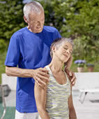 Sie setzen sich aufrecht auf einen Stuhl. Ihr Partner stellt sich hinter Sie und drückt mit den Händen Ihre Schultern nach unten. Sie neigen den Kopf nach links, bis Sie von dem rechten Ohr zur rechten Schulter ein Ziehen wahrnehmen. Dasselbe wiederholen Sie zur anderen Seite. Dann Rollentausch. Dehnt Hals und Nacken