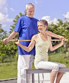 Sie sitzen im Reitersitz auf einer Bank oder rittlings auf einem Stuhl. Sie halten mit beiden Händen einen Stab oder Besenstiel waagrecht hinter Ihren Schultern. Ihr Partner fasst den Stab an den äußeren Enden und dreht mit dessen Hilfe Ihren Oberkörper und Kopf zur rechten Seite. Vorsicht: Nicht das Becken mitdrehen. So lange dehnen, bis Sie ein leicht unangenehmes Ziehen in Taille und unterem Rücken spüren. Dann zur anderen Seite wiederholen. Partnerwechsel nicht vergessen. Dehnt Taille und unteren Rücken