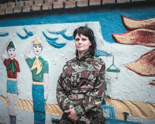 Masha, a hairdresser from Luhansk who joined the pro-Ukrainian Donbas Battalion last spring, at a training camp near Dnipropetrovsk, held in an old summer camp still decorated with Soviet-era Young Pioneers, July 2014; photograph by Justyna Mielnikiewicz from her series ‘A Ukraine Runs Through It,’ which has just been awarded the Aftermath Project’s 2015 grant for photographic work documenting the aftermath of conflict. It will appear in War Is Only Half the Story, Volume 9, to be published by the Aftermath Project next year.