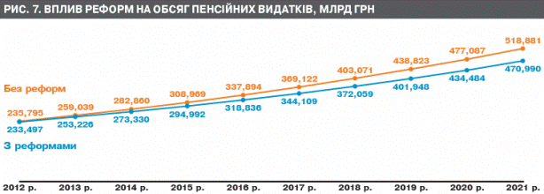 У 2021 р. масштаби економії на пенсійних видатках сягатимуть 47,9 млрд грн, а дефіцит пенсійної системи буде меншим майже на 53 млрд грн. І лише за умови продовження реалізації заходів реформування, запроваджених у 2011 р., бюджет Пенсійного фонду буде збалансований (принаймні до 2021 р.).