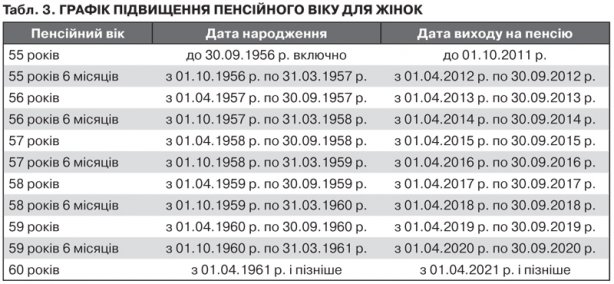 Поступове підвищення пенсійного віку для жінок здійснюється за графіком залежно від дати народження, з кроком "півроку на рік". Оскільки дати народження розписано по шестимісячних інтервалах, може скластися хибне враження, що пенсійний вік підвищується кожні півроку і темп підвищення сягає "щороку на рік". Але якщо розписати графік не лише за датами народження, а й за очікуваними датами виходу на пенсію, картина стає більш зрозумілою (табл. 3).