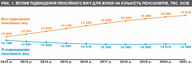 За результатами актуарних розрахунків, підвищення пенсійного віку для жінок дає змогу зменшити загальну кількість пенсіонерів у 2012 р. на 132 тис. осіб, а у 2021 р. (коли закінчиться підвищення) — більш як на 1 млн. осіб (рис. 1).