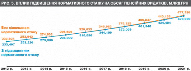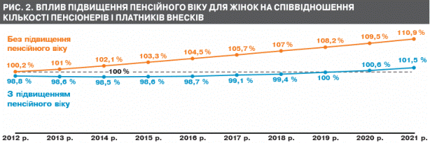 У 2012 р. підвищення пенсійного віку дало змогу зменшити дефіцит пенсійних коштів на 2,5 млрд грн. За прийнятих прогнозних припущень, у 2017–2020 рр. бюджет Пенсійного фонду матиме профіцит, і хоча у 2021 р. (після завершення підвищення пенсійного віку) дефіцит знову виникне, він буде значно меншим. Якщо ж підвищення пенсійного віку буде скасовано, пенсійна система залишатиметься весь час дефіцитною. Причому після 2017 р. у зв'язку із збільшенням співвідношення кількості пенсіонерів і платників внесків та сповільненням динаміки заробітної плати дефіцит почне стрімко зростати і в 2021 р. досягне 45,3 млрд грн.