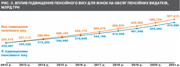 Підвищення пенсійного віку дало змогу зменшити сумарний обсяг пенсійних видатків у 2012 р. на 1,9 млрд грн, а у 2021 р. економія досягне 36,4 млрд грн.