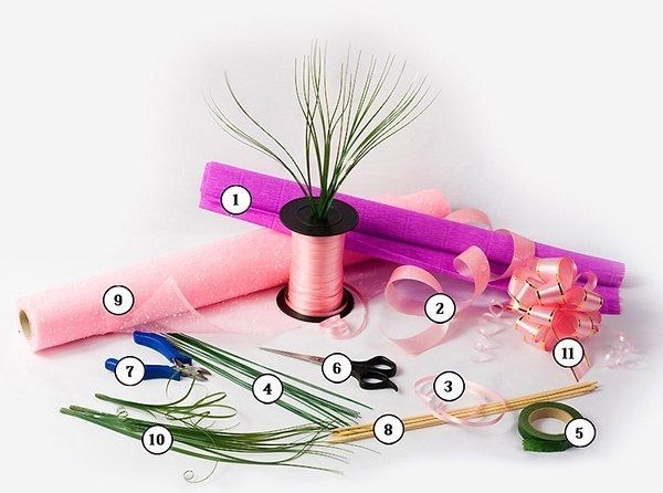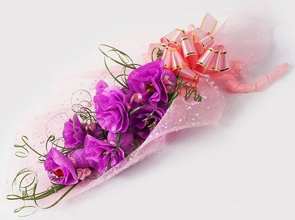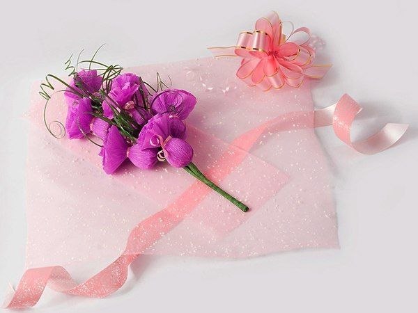 9. Коли букетик готовий, загортаємо його плівкою з візерунком чи подарунковою сіткою для квітів, зв’язуємо широкою рожевою стрічкою та прикріплюємо бант.