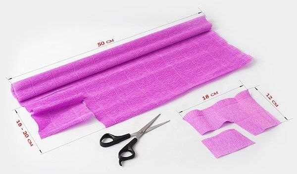 1. Беремо фіолетовий гофрований папір та вирізаємо прямокутник 18х12 см. З боку цього прямокутника вирізаємо менший — розміром 9х6 см.