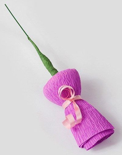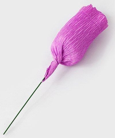 4.Вставляємо паличку в циліндр із цукеркою, хвостик цукерки має дивитися вгору. Притискаємо нижню частину гофрованої «квітки» до скотчу на паличці та обкручуємо навколо черешка так, щоб цукерка опинилася в центрі квітки.