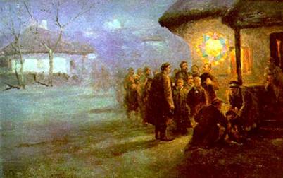 Цей одвічний мотив родинного благополуччя тісно пов'язувався з обрядом колядування. Як відомо, діти і дорослі окремо колядували. Якщо діти починали обходити хати з колядою вже від Свят-вечора, то старші колядники — тільки з наступного дня. Парубочі ватаги колядників ходили з великою «звіздою», дівочі — з ліхтарем, що нагадував місяць. Гурти колядників супроводили переряджені: «коза», «дід», «баба», «циган» та ін.