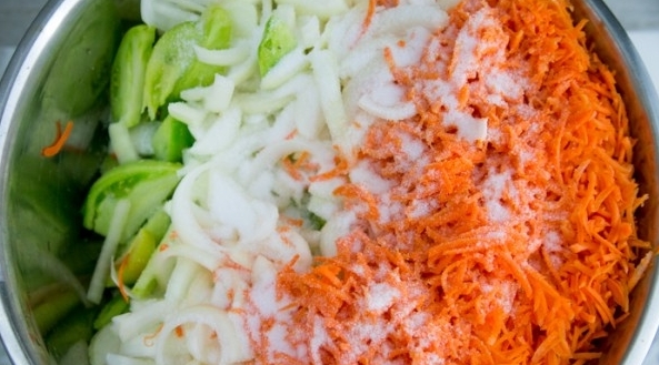 На 1 кг зелених помідорів потрібно: 2-3 стручки солодкого перцю, по 500 г моркви і цибулі, ? склянки рослинного масла, 1 ст.