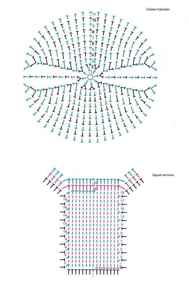 Перед тим, як приступити до в’язання вивчіть схему. Коло — це носок, друга схема — п’яти та задньої частини. Бажано мати можливість час від часу приміряти шкарпетку, якщо ви початківець. Теж можна коригувати схему в’язання, якщо вам здається невеликим розмір. В середньому розраховуйте своє в’язання на 45 розмір ноги, хоча є і українські велети із 48-им розміром (із практики). Тож, розпочніть в’язання із  «чарівного кільця» (тут опис http://www.goodhand.com.ua/2014/01/vidkritka-iz-vyazanim-sercem-do-dnya-svyatogo-valentina/), далі в’яжемо за схемою кола. Провязавши 9-11 рядів з додатками, продовжуємо в’язання по колу напівстовпчиками. Тут в’яжемо довжину стопи на ваш розсуд — може бути 15 см. Далі ще 5 ряочків із додаванням по 1 стовпчику в боки рядка. Потім починайте в’язання п’ятьма стовпчиками без накиду прямими і зворотними рядами за другою схемою на середній частині підошви, перейшовши до початку в’язання сполучними стовпчиками. В’яжучи п’яту одночасно приєднуйте її до миска до середини. Далі в’яжіть халяву напівстовпчиками до потрібної величини.