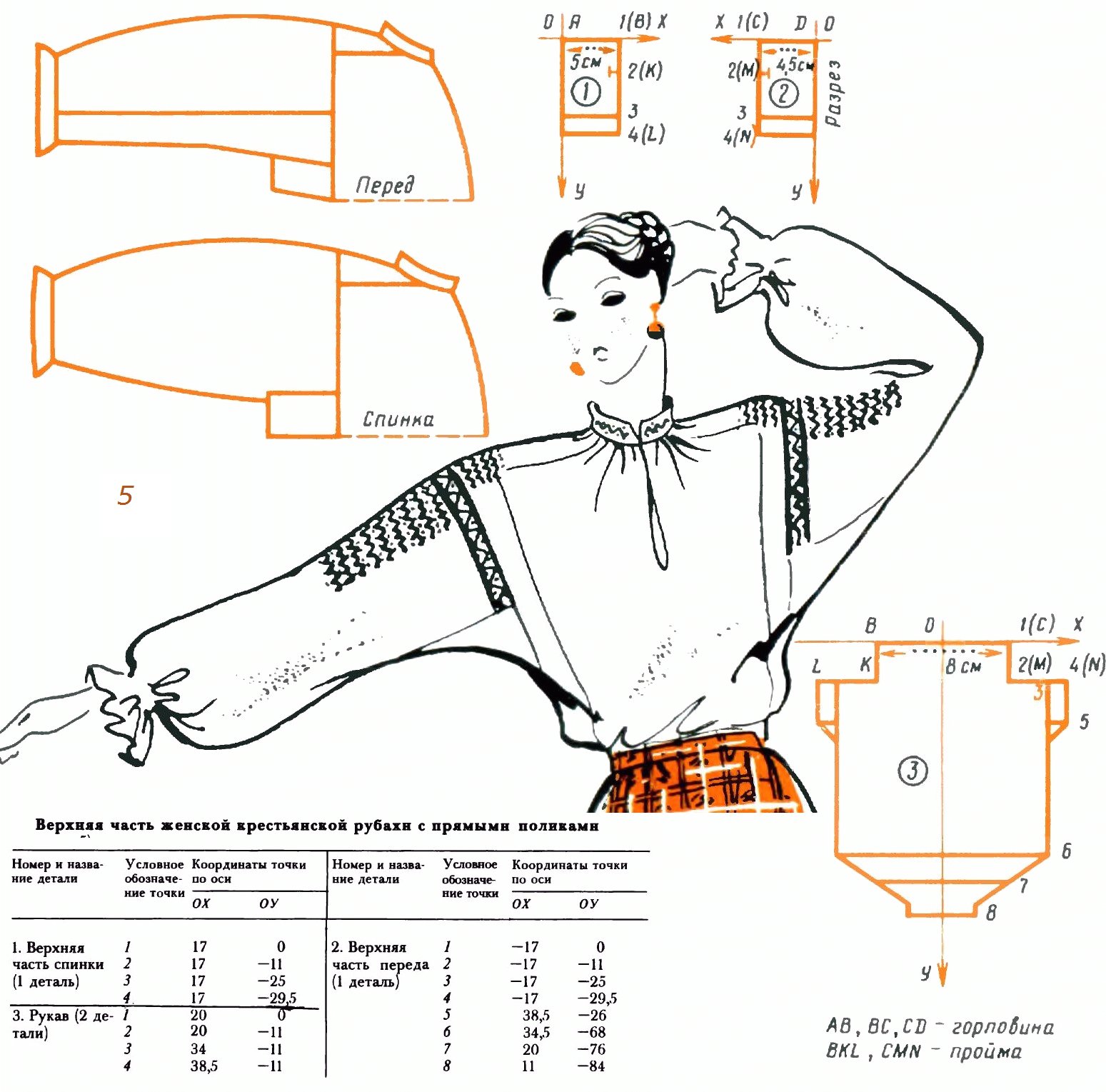 Сутність конструктивних прийомів побудови креслення даної сорочки полягає в наступному: виріб створюється на основі прямокутних деталей крою; збірки, що йдуть від лінії горловини на кожній деталі, створюють необхідний обсяг відповідно до форми фігури: спереду - для забезпечення опуклості на грудях, ззаду - для створення свободи руху в області спинки, у верхній частині рукава - для оформлення плеча. Великий виріз горловини з відповідною кількістю збірок забезпечує хорошу посадку виробу на повних і худих фігурах, не створює збільшеного об'єму виробу на фігурах невеликих розмірів, а прямі лінії крою не створюють візуального збільшення об'єму всього виробу. Конфігурація пройми нагадує пройму вироби з рукавами покрою реглан.