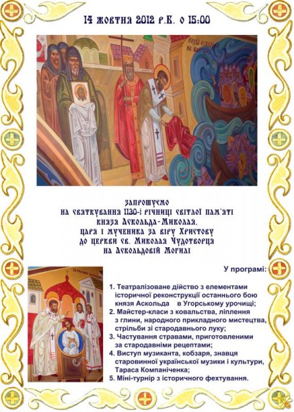 Осередками народних гулянь стануть козацьке селище "Мамаєва Слобода" за адресою: вул. Михайла Донця, 2 та Співоче поле Печерського ландшафтного парку. Так, долучитися до традиційного відзначення одного з найшановніших свят в Україні – Покрови – у неділю усіх охочих запрошує "Мамаєва Слобода".Святкова програма розпочнеться о 8:30 церковним передзвоном та Божественною літургією у козацькій церкві Покрова Пресвятої Богородиці. О 12:00 на Ярмарковому майдані "Мамаєвої Слободи" відбудуться урочистості з нагоди відзначення Дня українського козацтва. Відвідувачі побачать показовий виступ кінного козацького каскадерського підрозділу, концерт козацьких та фольклорних колективів, кобзарів, лірників. Також кияни та гості міста зможуть побачити фехтування на шаблях, стрільбу з лука у виконанні козаків Печерської сотні реєстрового козацтва. На честь свята пролунають залпи з гармат: фальконетів та ожиг. Крім того, відбудуться: ярмарок народних майстрів, частування козацьким кулішем та гарбузовою кашею, народні гуляння з відтворенням давніх козацьких забав та дужань, а також майстер-клас із середньовічних козацьких та шляхетських танців. Також у неділю о 13:00 на Співочому полі Печерського ландшафтного парку для киян та гостей міста відбудеться концерт творчих колективів Київського міського центру народної творчості та культурологічних досліджень. До того ж охочі зможуть відвідати виставку хризантем "Ілюзії осені". Довідка: Покрова Пресвятої Богородиці — християнське і народне свято, відзначається церквами східного обряду (православними та греко-католиками) 14 жовтня. З 1999 року свято Покрови в Україні відзначається як День українського козацтва. 1942 року у цей день було офіційно утворено Українську повстанську армію, тому традиційно це також день УПА. За легендою, у цей день військо давніх русів на чолі з Аскольдом взяло в облогу центр православ'я — Константинополь, намагаючись захопити місто. Мешканці столиці Візантії у гарячий молитві звернулись до Богородиці з проханням про порятунок. І Богородиця, за оповіданнями, з'явилася перед людьми та вкрила їх своєю покровою (омофором). Після цього вороги вже не могли побачити цих людей. Джерело ******* 70 років пам'яті УПА 14 жовтня 2012 р.Б. о 13:30 у церкві св. Мтколая Чудотворця на Аскольдовій Могилі буде відслужено панахиду 70 років пам'яті за усіх полеглих воїнів УПА, та пам'яті жертв переселення з Закерзоння. Визнати не можна зрозуміти? Афорізм «першою жертвою війни стає правда» доволі точно ілюструє ситуацію з визнанням заслуг воїнів Української повстанської армії (УПА), що боролися за незалежність батьківщини у 40-50-х роках ХХ сторіччя. Парадокс, але кілька тисяч сивочолих ветеранів УПА, що залишилися в живих, і на 21-му році незалежності України продовжують бути ізгоями... //projects.dt.ua/upa Трагедія депортації українців в 40-х рр. ХХ століття в історії залишила невиправні сліди, рівно як депортації німців, поляків, кримських татар, греків. Близько 400 тис. українців було депортовано радянською владою з Західної України до Сибіру, ще більшу кількість у формі етнічної чистки було вивезено спільно комуністичними режимами СРСР і ПНР з територій нинішньої Польщі. Можна виділити три етапи виселення українців зі своїх прадавніх земель у Польщі: 1) трансфер населення між ПНР і УРСР 1944-1946 рр.; 2) акція “Вісла”2; 3) д
