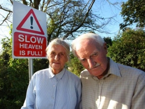 Літня пара самостійно встановила дотепний дорожній знак з написом "Пригальмуйте - в раю немає місця", щоби водії їздили повільніше.