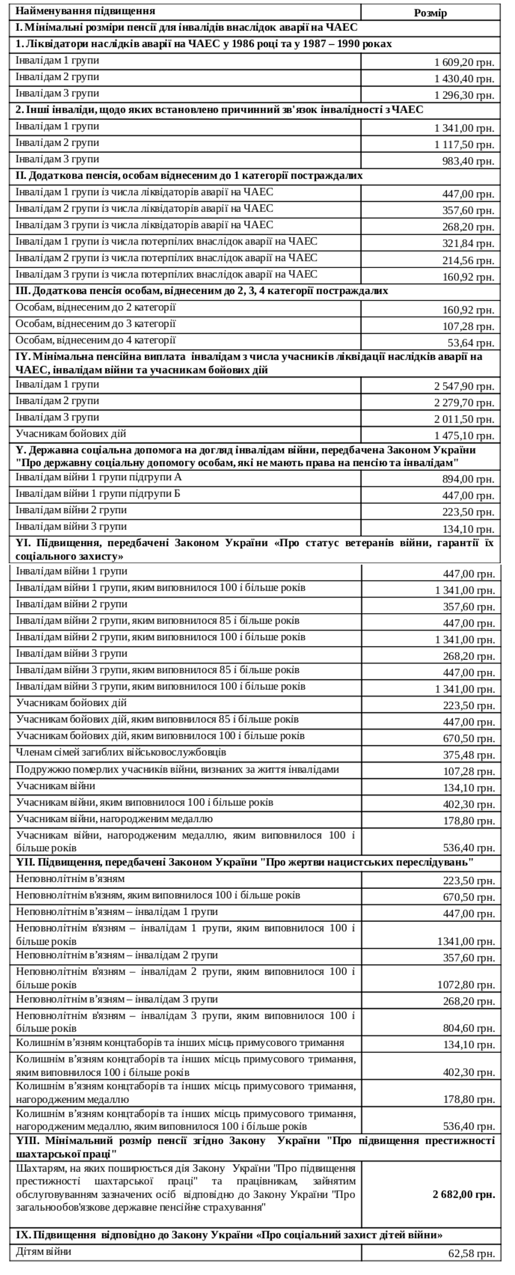 У зв’язку зі зміною прожиткового мінімуму органами Пенсійного фонду проведено перерахунки складових пенсійних виплат, які визначаються від розміру прожиткового мінімуму: мінімальний розмір пенсії, доплата за понаднормовий стаж, мінімальна пенсійна виплата, підвищення ветеранам війни, пенсії за особливі заслуги перед Україною та інші доплати і надбавки.