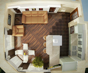 Щоб відділити кожну зону, можна використовувати підлогове покриття. Наприклад, зона приготування і прийому їжі - керамічна плитка, у вітальні - ламінат або паркет, а в зоні відпочинку використовуйте килимове покриття. Підбирати це все потрібно відповідно до загальної стилістики інтер'єру. Ще один прийом в дизайні інтер'єрів - зони можна розділити декором на стінах. Фарбування або шпалери, плитка - можна використовувати кілька кольорів або відтінків.