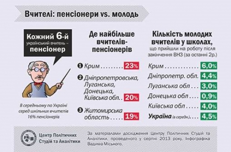 «Кожен шостий викладач у школі є пенсіонером. Якщо говорити по регіонах, то найбільше пенсіонерів в Криму – до 23% від загальної кількості викладачів. Далі йдуть Дніпропетровська, Луганська, Донецька та Київська області – там кількість пенсіонерів складає 20%», – розповіла пані Слизьконіс. Так, за результатами дослідження питань шкільної освіти, найбільше вчителів-пенсіонерів припадає саме на ті регіони, де спостерігається брак молодих фахівців.