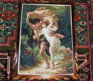 - Оці картини мені найдужче подобаються, - показує майстриня на два великих полотна, обрамлені рамками. На одному з них юнак та дівчина на гойдалці, інше називається «Гроза». Картини дуже гарні, яскраві.