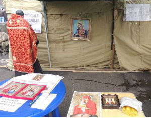 Християнські конфесії не просто словами та своїми молитвами підтримують активістів Євромайдану. Днями тут запрацювала навіть наметова капличка, де усі бажаючі можуть поспілкуватися з священиком, подати записки «За здоров’я» та «За упокій» і просто помолитися перед святими іконами.