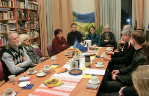 Напередодні саміту Східного партнерства українці зібралися у Домі національних товариств позапланово – чекають у гості голову Світового конгресу українців Євгена Чолія. У кімнаті великий стіл, на якому у синьо-жовтих пластикових тарілках розкладене печиво. Стіни приміщення заставлені книжками. Там серед української та литовської літератури сором’язливо тулиться маленький портрет Ющенка. А от Тарас Шевченко упевнено дивиться на присутніх із трьох портретів різного розміру.