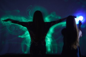 У ході відкриття художник представила пісочну та світлову анімацію, роботу, виконану технікою ебру - малюнок на воді, а також колекцію одягу з принтом робіт, виконаних у техніці піскової анімації. Крім того, на виставці представлені репродукції картин, виконаних в цій техніці. Експозиція отримала філософську назву «Три світи бачимо ми, але тільки у двох живуть вони - мешканці Землі».
