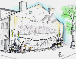 Художник та дизайнер ПП Олексій Огонь починає створення пам’ятної стіни – художньо-скульптурної композиції «НЕБЕСНА СОТНЯ» на основі малюнку Рівненського художника, музиканта Юрія Журавля.
