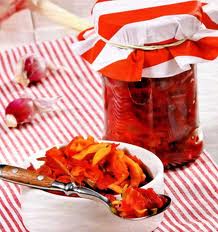 На 4 кг червоних стиглих помідорів: 1 кг червоного солодкого болгарського перцю, 0,5 кг моркви, 1 стол.ложка солі, півсклянки цукру, півсклянки рафінованої олії, 1/3 склянки оцту, 1-2 стручки гіркого перцю, 1-2 цілі головки часнику, зелень.