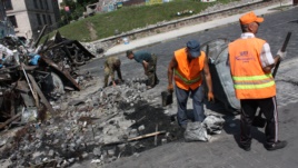 Комунальники Києва у четвер вранці у супроводі міліціонерів розбирають барикади і намети на майдані Незалежності. Прибирають намети з боку готелю «Козацький», біля Будинку профспілок і вздовж Хрещатика, неподалік Пасажу.