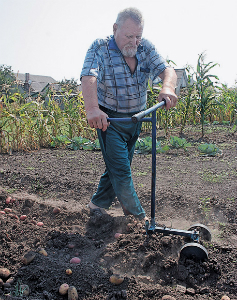 Ми спостерігаємо, як вправно й швидко агрегат викопує дорідну картоплю. Керують ним удвох з Вірою Іванівною. Модифікована «лопата», яку притримує Михайло Григорович, легко заходить у грунт і завдяки тросу, який намотується на лебідку на іншому кінці рядка, швидко рухається, піднімаючи на поверхню бульбу без найменших пошкоджень. Залишилося тільки зібрати вирощене у мішок. Ми спостерігали за віконцем електролічильника: виявилося, цей механізм споживає зовсім мало електроенергії — у перерахунку на вісім соток виходить близько десяти кіловат-годин.