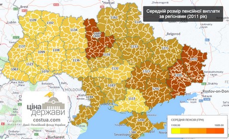 Відповідно до даних за 2011 рік, середній розмір пенсійних виплат в Києві та Київській області відповідно становив 1689 та 1488 грн на місяць, в Донецькій області – 1550 грн, в Луганській області – 1470 грн.
