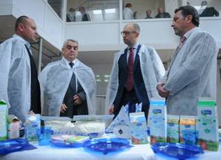 Арсеній Яценюк (другий праворуч) сьогодні відвідав молокозавод у Лубнах на Полтавщині