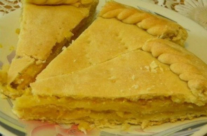 Тісто розділити на 3 частини різного розміру. Розкачати 1 коло великий , 2 кола поменше. На сковороду, змащену рослинним маслом, розкладемо велике коло. Шар половини лимонно-апельсинової начинки. 2 коло зверху ( піднімаючи кінці до країв першого кола ). Знову шар начинки. Розкладемо 3 коло, з’єднуючи краю в гарну хвилю. Залишити на 30 хвилин. Можна відразу в духовку, попередньо проколовши виделкою в декількох місцях, щоб тісто не піднялося.