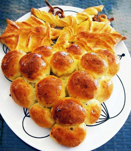 Добре защипати краї, оформити пиріжки у вигляді колобків і приступити у формуванні пирога, як показано нижче на покрокових фото.