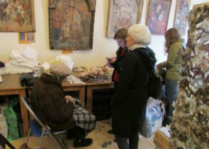 Минулого вівторка опівдні до церкви поспішає 40-річна Ірина Маковій. Обходить довкола храм, іде за вказівником до чорного входу. У приміщенні посеред великої кімнати стоїть дерев'яний збитий каркас, на ньому натягнута рибальська сітка. Довкола четверо жінок протягують скрізь отвори шматки камуфльованої тканини. Попід стінами за столами працюють ще кілька дівчат, ріжуть тканину для сіток і устілок.
