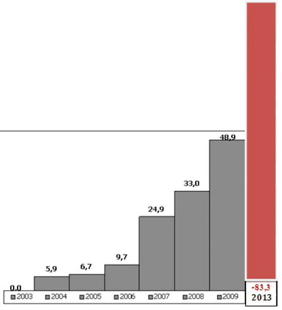В той статье были приведены цифры посредством таблиц и графиков. Спустя четыре года я повторяю эти графики, но в обновленном виде - добавляя данные 2013 года для каждого показателя. Получилось очень наглядно.