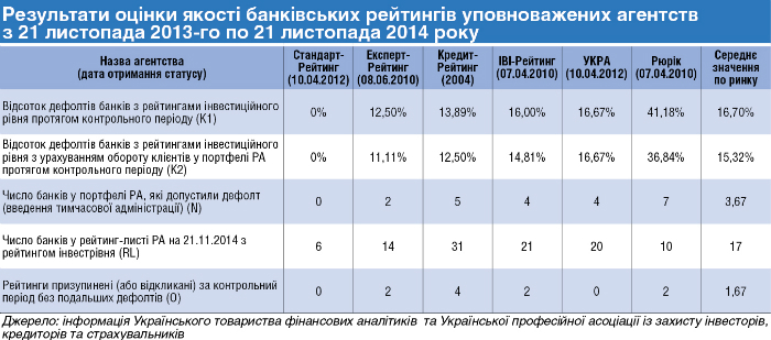 Інвестор, що розмістив грошові кошти в 36—40 банках з рейтингами інвестрівня цього агентства, протягом контрольного періоду втратив би тільки 13,89 гривні з кожних 100 розміщених. Це краще середнього відсотка дефолтів у клієнтському портфелі РА по ринку. Кращий за середній по ринку результат показали також РА «IBI-Рейтинг» та УКРА. А НРА «Рюрік» виконувало свою функцію на рівні, близькому до критичної позначки.