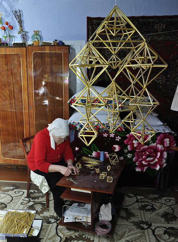 На маленькому дерев’яному столику – моток ниток, циганська голка, ножиці й кусачки. На підлозі лежать декілька коробочок з соломою. Дарія Андрусяк ретельно підбирає соломинки однакового розміру. Де треба підрівняти, підрізує ножицями. Через кілька хвилин у руці майстрині вже акуратний пучечок з 12 соломин. Згодом жінка сплете з них так звані ліхтарики, а вже через два тижні з’явиться готовий солом’яний павук.
