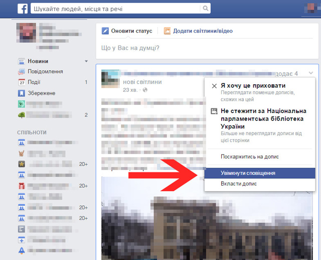 Щодо допису, який вас цікавить, ви також можете увімкнути сповіщення — наприклад, якщо хтось виклав фотографію, і ви хочете стежити за коментарями під нею та «лайками», ви можете скористатись функцією «Увімкнути сповіщення» у Додаткових налаштуваннях.