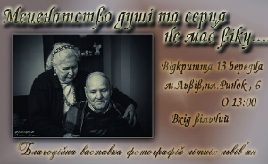 Завтра, 13 березня, у Львові відкриють благодійну виставку фотографій літніх львів’ян «Меценатство душі та серця не має віку». Відкриття відбудеться о 13.00 год. у приміщенні Львівського Історичного музею (пл. Ринок, 6). Вхід вільний. Зібрані кошти будуть передані сім’ям, які втратили рідних в зоні АТО, повідомила прес-служба ЛМР.