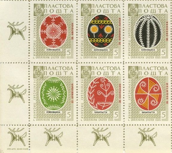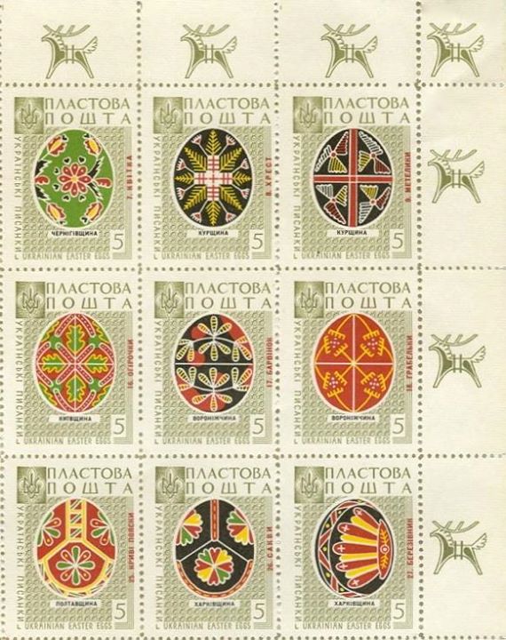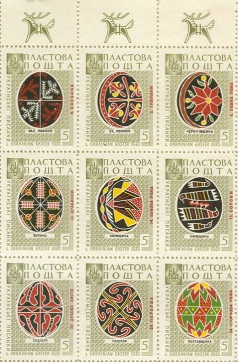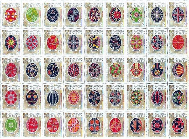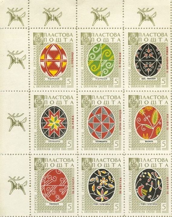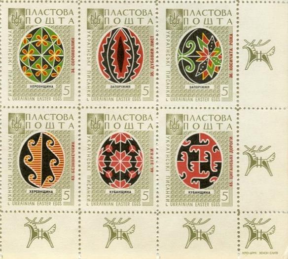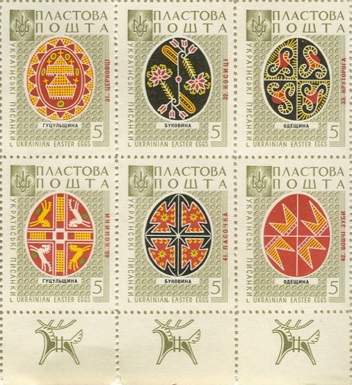 Марки “Пластової пошти” із зображеннями писанок різних регіонів України були надруковані 1959 року в Канаді. Марки розміщувались на одному листі, що мав номер 45. Принцип розміщення марок-писанок на листі відповідає географічному регіонові України, звідки ті писанки походять.