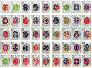 45 українських традиційний великодніх писанок, що зображені на марках, були створені майстром з писанкарства Ярославом Елиївим як презентація 23 етнографічних регіонів України. Дизайн самих марок виконав художник Мирон Лев. Марки були надруковані у видавництві “Літо-Друк” у п`яти кольорах: червоний, зелений, жовтий, оливковий і чорний. Ця надзвичайно цікава серія великодніх марок дуже часто пізніше використовувалася для написання інших писанок та дизайнерських рішень.
